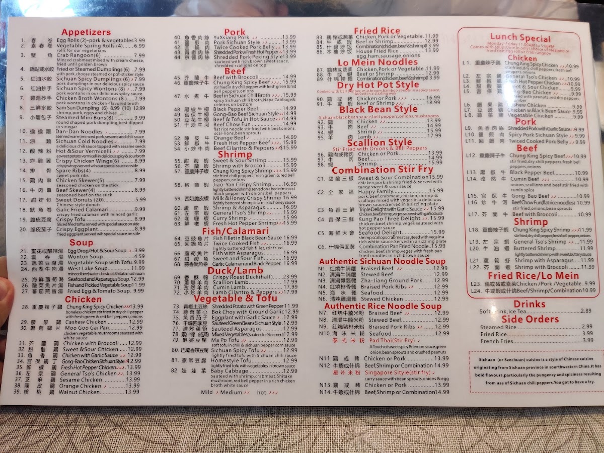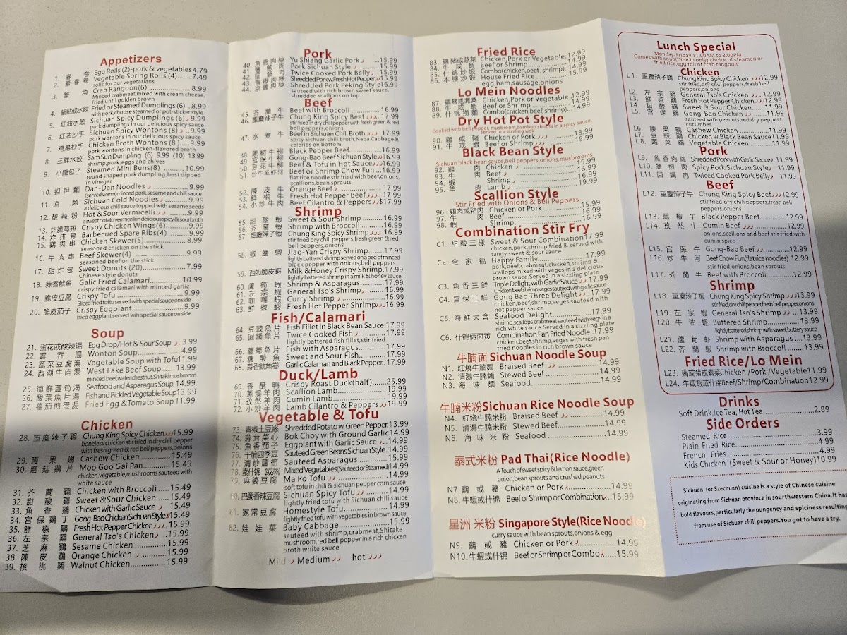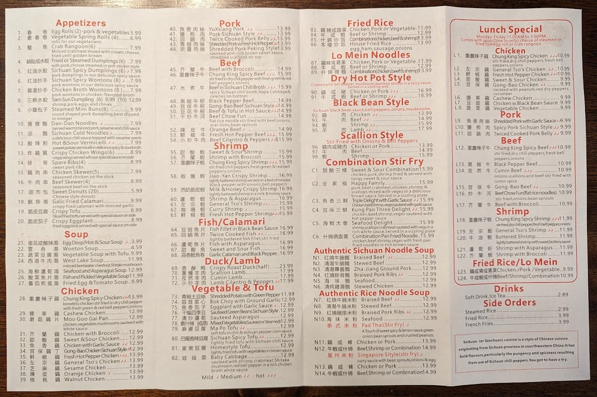 This menu is suitable for casual dining occasions where guests may choose from a variety of authentic Sichuan flavors, accommodating both quick orders and more leisurely meals through an assortment of appetizers, main courses, and sidedishes.