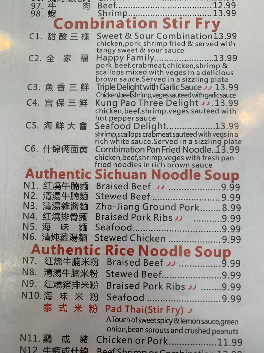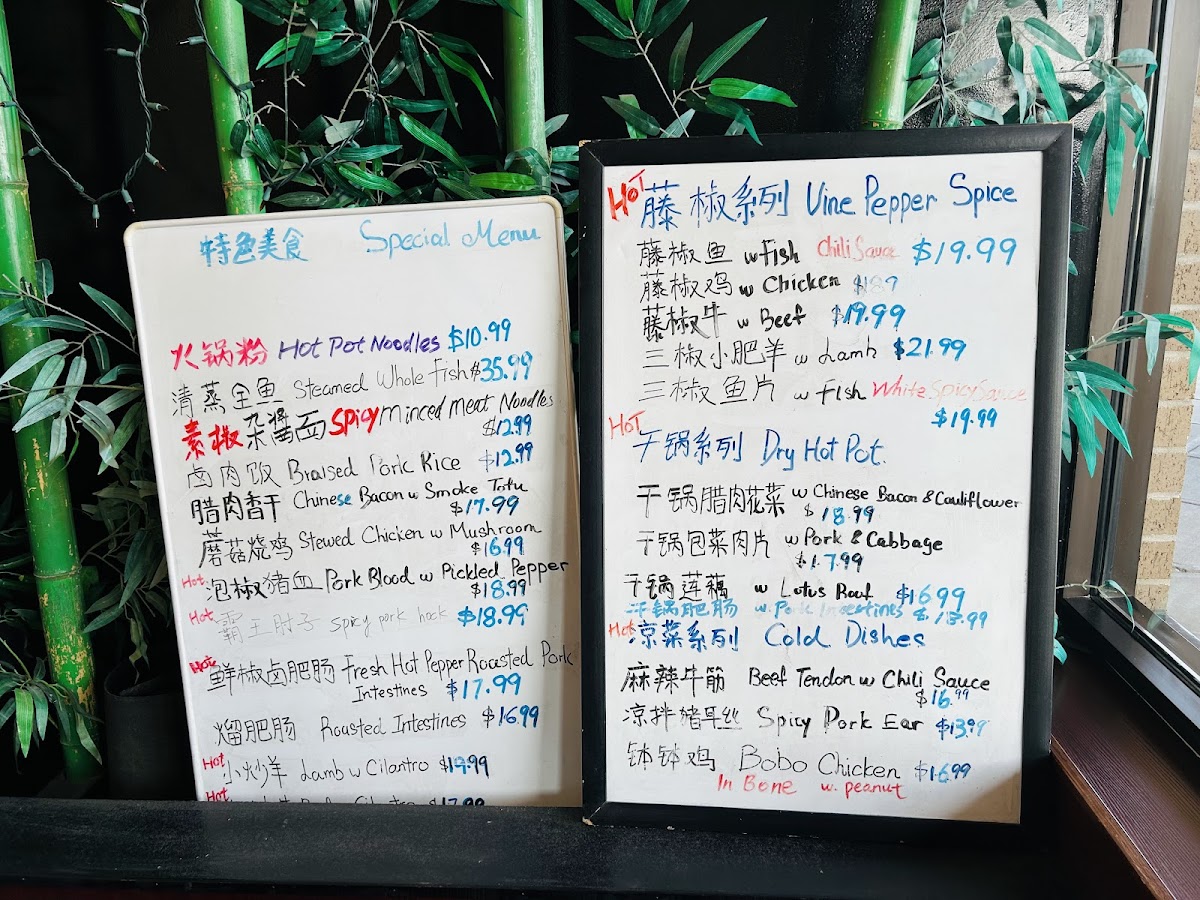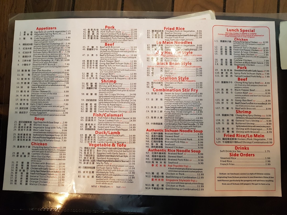 This menu is suitable for casual dining occasions where guests may choose from a variety of authentic Sichuan flavors, accommodating both quick orders and more leisurely meals through an assortment of appetizers, main courses, and sidedishes.